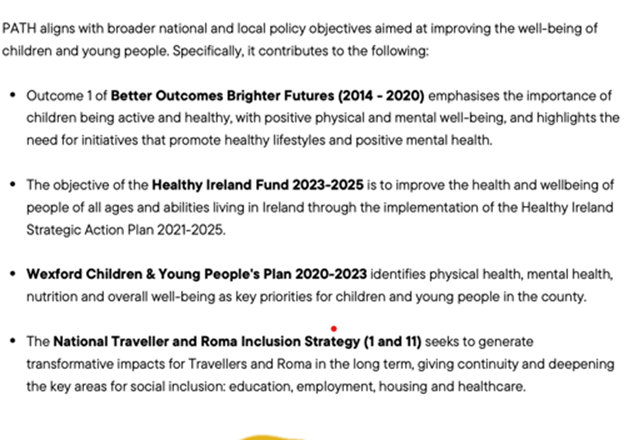 PATH aligns with Outcome 1 of “Young Ireland” and to Goal 2 of the Healthy Ireland Framework. It is funded by the CYPSC Healthy Ireland Fund.